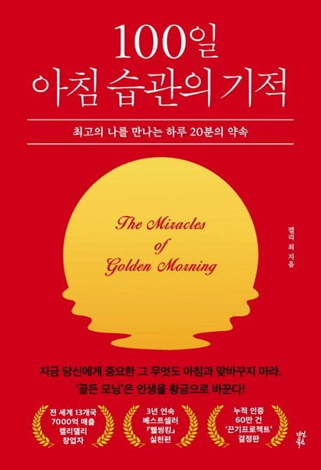 “당신에게 황금빛 아침, ‘골든 모닝’을 선물하라” 찬란한 인생을 여는 내 평생 가장 위대한 시작. 당신은 아침의 힘을 믿는가? 아침에 일어나 단 20분으로 하루를 완벽하게 세팅할 수 있다면 그렇게 할 의지가 있는가? 저자 켈리 최는 이 책 『100일 아침 습관의 기적』에서 자신의 인생을 역전시키고 부와 성공을 거머쥐게 한 원천으로 아침의 힘을 꼽는다. 아침은 잠재의식이 활발해지는 황금시간대로, 인생을 황금으로 바꾸는 ‘골든 모닝’이다. 역사상 가장 크게 성공한 많은 이들이 주체적인 삶을 살았던 원천은 아침에서 나왔다. 그들은 매일 아침 하루가 가장 이상적으로 흘렀을 때를 상상하며 시각화하고 확언한다. 이로써 미래를 대비하고 현재를 바꿀 동력을 얻으며 원하는 인생과 목표를 잠재의식에 깊게 심는다. 루틴을 실천하는 데는 하루 20분이면 충분하다. 아침에 일어나서 20분을 어떻게 보내느냐에 따라 하루가 달라진다. 부와 성공을 거머쥐는 사람은 최고의 컨디션과 기량을 가장 오래, 자주 발휘하는 사람이다. 매일 아침 골든 모닝을 맞이하는 것은 자신에게(혹은 소중한 사람에게) 줄 수 있는 인생의 가장 큰 선물이다. 어쩌면 바로 오늘이 그 위대한 시작의 날이 될 수 있다. “모닝 시크릿이 습관이 되는 순간 미라클 인생이 내 것이 된다!” 아침의 풍요를 인생의 번영으로 만드는 끌어당김의 기적. 저자가 말하는 20분의 아침 습관은 어렵거나 복잡하지 않다. 오히려 누구나 적용할 수 있을 정도로 간단하고 상식적이기에, 꾸준한 실천이 더욱 중요하다. 사람에게는 육체와 정신과 영혼이 있다. 세 가지 속성을 균형 있게 자극해 자신이 원하는 방향으로 움직이게 할 때, 잠재의식을 최대로 활용할 수 있다. 저자는 매일 아침 20분간 실행할 때 삶의 변화를 촉진할 수 있는 강력한 다섯 가지 루틴을 제안한다. 먼저 영혼에 지혜와 행복, 평온함을 심기 위해 3분 시각화, 3분 확언을 수행한다. 이어 정신에 지식과 성장을 심기 위해 1분 명언 필사와 3분 독서를 수행한다. 마지막으로 육체에 에너지와 건강을 심기 위해 10분 운동을 수행한다. 물론 자기 상황에 맞게 시간이나 순서를 조절하면서 궁극적으로는 자신만의 루틴을 만들면 좋다. 중요한 것은 루틴을 습관화하여 잠재의식의 알고리즘을 내가 원하는 방향으로 인도하는 것이다. 습관은 꿈이 현실로 다가오도록 행동을 자동화해 이끄는 힘이다. 습관을 만들고 유지하는 5단계 설루션(결단-선언-협업-인증-보상)은 꿈을 현실화하는 강력한 전략이다. 전 맥도널드 CEO 드니 하네 칸의 말처럼 “이 책은 변화와 성장의 방향타다.” 저자는 자신이 몸소 실효성을 증명한 노하우를 바탕으로, 변화를 꿈꾸는 당신을 위해 이 책을 썼다. “포기하지 않는 한, 당신 인생의 때는 매일 다시 뜨겁게 떠오른다. 당신 안의 위대한 당신을 깨워라!” 켈리 최의 100일 골든 모닝 마스터플랜. 저자는 부자란 원하는 일에 충분한 돈과 시간을 쓸 수 있는 사람이라면서 돈의 주인이 되기 전에 시간의 주인이 되라고 말한다. 돈의 그릇을 키우면 돈이 많이 담기는 것처럼 시간도 마찬가지다. 시간 그릇을 키우면 내가 주도할 수 있는 시간이 질적, 양적으로 늘어난다. 특히 남들이 생각하기에 정말 빠르게 부와 성공을 일군 사람들은 시간 활용에 ‘집착’해 마침내 시간을 자기편으로 만든 사람들이다. ‘100일’은 시간 그릇을 키우고 끈기를 단련하기에 좋은 기간이다. 저자는 ‘100일 끈기 프로젝트’를 기획해 독서, 운동, 시각화 등 다양한 도전으로 많은 사람의 변화를 도모했다. 그와 함께한 90% 이상의 사람이 끈기가 있다는 걸 증명해 냈다. 자기를 끈기가 없다고 단정 짓던 사람들도 자신의 새로운 모습에 감동하며 엄청난 에너지를 얻었다. 완전히 다른 삶을 살게 된 것이다. 이 책은 저자 자신의 인생을 비롯한 수천 명의 인생을 바꾼 구체적인 실천법을 더 많은 사람에게 전하기 위한 실전 가이드 그 자체다. 아침을 주도하는 100일 습관을 인생 전체에 걸쳐 실천하면 인생이 황금비율로 바뀌는 시간 부자가 될 수 있다. 이 책을 펼쳐든 당신도 오늘부터 100일간 아침 습관의 기적을 이루겠다고 결단하고 함께해 보라. 저자의 말처럼 “결단할 때 비로소 의미 있는 오늘이 시작된다.”