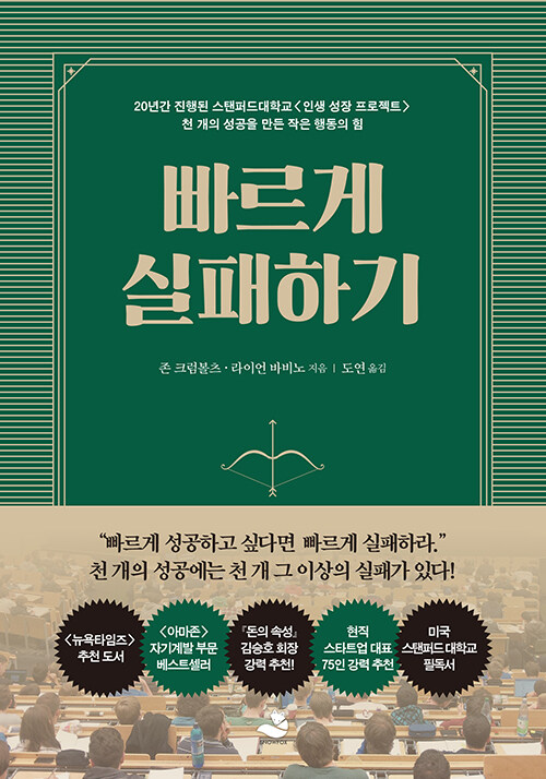 저자 존 크롬볼츠와 라이언 바비노는 미국 진로 상담분야의 최고 권위자이며 교수다. 그들은 미국상담협회로부터 ‘살아 있는 전설’상을 수상했으며 협회가 수여하는 ‘명예의 전당’에 오르며 업적을 인정받았다.『빠르게 실패하기』는 20년간 진행된 스탠퍼드 대학교의 <인생 성장 프로젝트> 연구에 참여하여 얻은 특별한 결과를 담은 책이다. 저자들은 연구기간 동안 성공한 사람들에게 나타나는 일련의 공통적인 행동 패턴을 찾았고 그 핵심내용을 이 책에 총 9개의 장으로 구성했다. 그들이 실험하고 제안한 이 ‘작은 행동의 힘’은 개인의 삶과 사업에 있어 가장 필요한 행동을 큰 준비 없이 즉각 실행하게 만든다. 그들은 ‘더 잘 준비되고, 더 대단한 목표가 성공에 중요한 요소가 아님을 밝혀냈다. 오히려 지금 당장 시작할 수 있는 작은 행동을 통해 더 많고, 잦은 실패에 성공의 열쇠가 있음을 발견하게 된다는 사실을 강조한다.